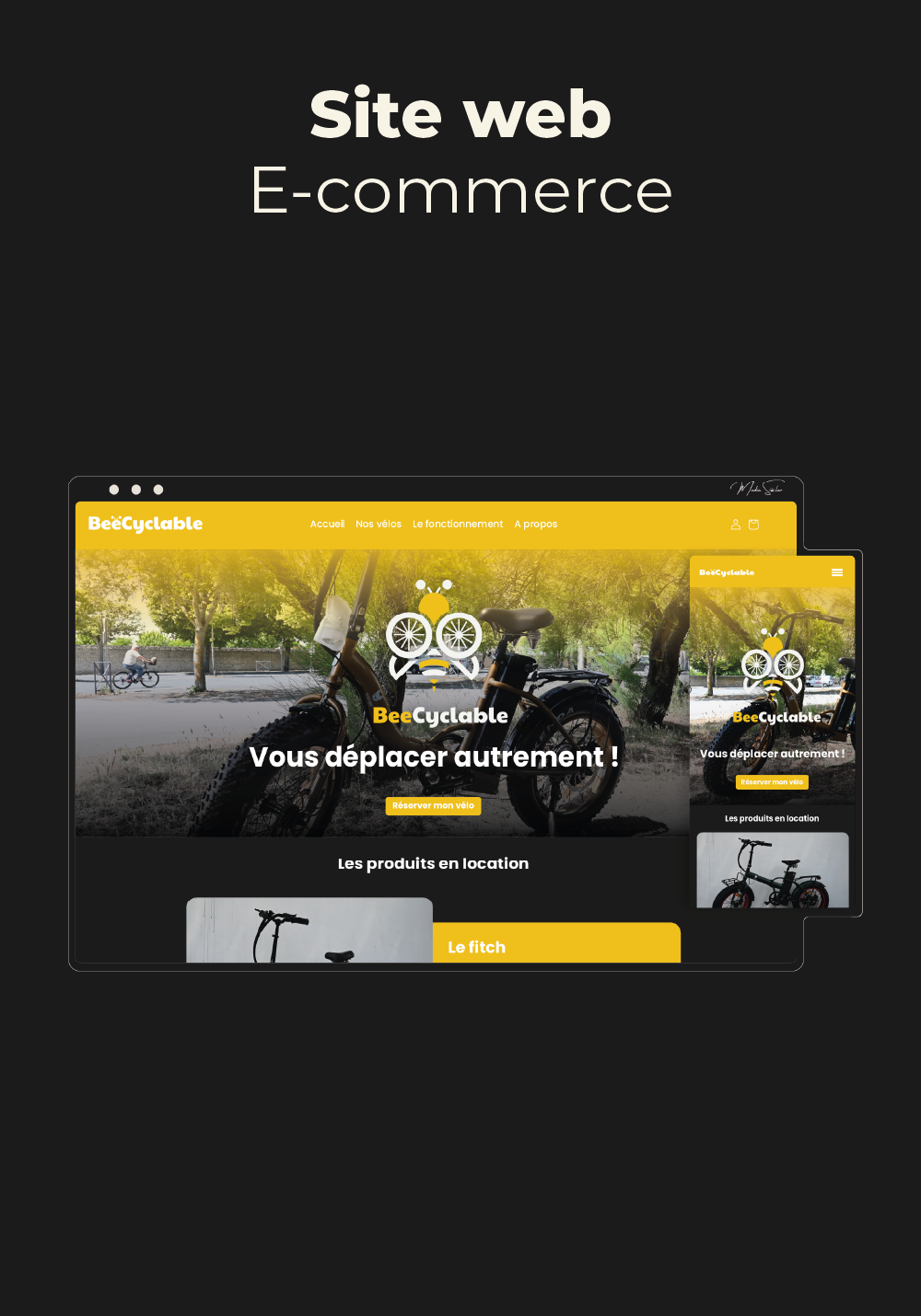 Pour BeeCyclable, jeune entreprise rochelaise spécialisée dans la location et la vente de vélos, nous avons conçu une communication globale afin d’installer une image de marque forte et cohérente. Le projet a débuté par la création de leur identité visuelle : un logo décliné sous plusieurs formats et une charte graphique pensée pour refléter à la fois l’aspect écologique et le dynamisme de la marque. Nous avons ensuite réalisé leur site e-commerce, intégrant un système de réservation en ligne permettant aux clients de louer facilement un vélo et de choisir un point de livraison. Afin d’illustrer l’offre de manière professionnelle, nous avons également organisé et dirigé un shooting photo des vélos. Ce projet complet a permis à BeeCyclable de se doter d’outils modernes et adaptés, posant les bases solides pour leur développement sur le marché local de la mobilité douce.