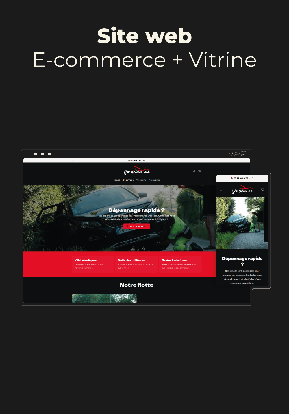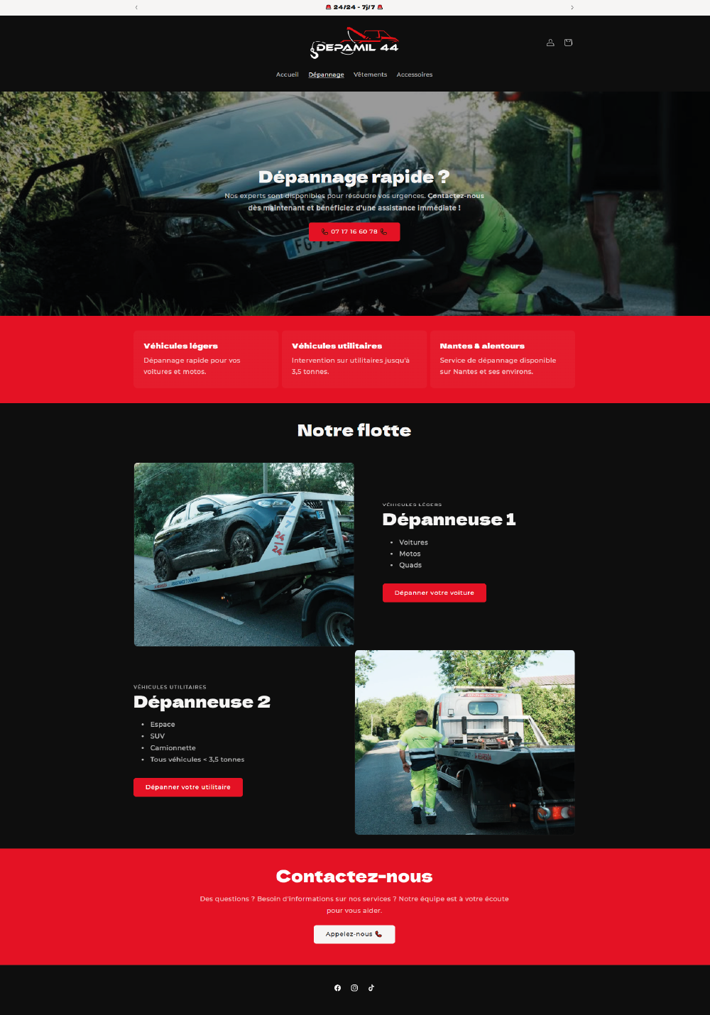 Pour Depamil 44, société de dépannage automobile basée à Nantes, nous avons conçu un site web hybride combinant à la fois une partie vitrine et une partie e-commerce. La section vitrine met en avant le cœur de leur activité : le dépannage rapide de véhicules légers et utilitaires, avec une présentation claire des services et de la flotte disponible. Cette partie permet aux clients de contacter facilement l’entreprise en cas d’urgence et de bénéficier d’une assistance immédiate. En parallèle, nous avons développé une boutique en ligne permettant à Depamil 44 de valoriser sa forte communauté sur les réseaux sociaux grâce à la vente de produits dérivés (vêtements et accessoires). Le site intègre une gestion complète du front-end et du back-end, avec un système automatisé de réception des commandes, simplifiant le suivi et l’expédition des produits. Ce double usage fait du site un outil à la fois opérationnel pour le dépannage et commercial pour la boutique, renforçant ainsi l’image de marque de Depamil 44 auprès de sa clientèle locale et de sa communauté en ligne.