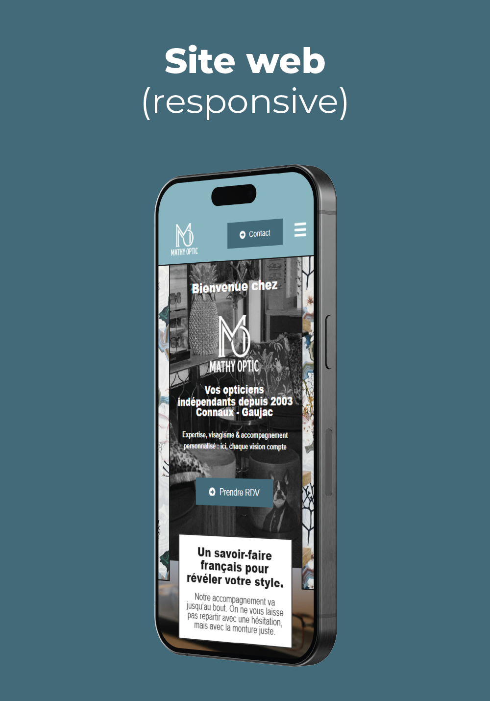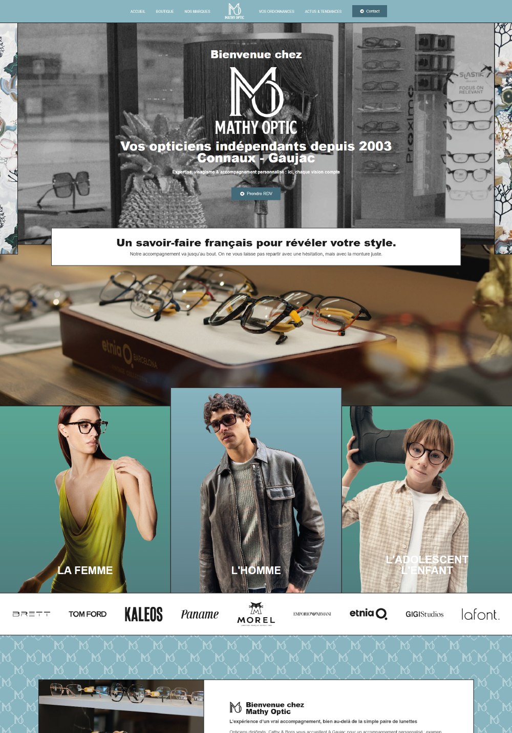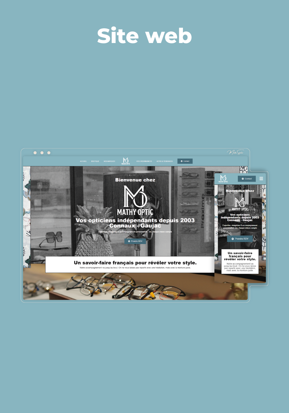 Pour Mathy Optic, opticien indépendant installé à Gaujac depuis 2003, nous avons réalisé leur tout premier site internet. L’objectif était de concevoir une plateforme claire et moderne permettant aux clients de découvrir l’opticien, d’obtenir facilement des informations pratiques et de simplifier le transfert de fichiers tels que les ordonnances. Ce projet a également permis de renforcer l’identité graphique de l’entreprise grâce à une cohérence visuelle déclinée sur leurs supports, notamment leurs cartes de visite.